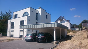 Flachdachabdichtung und Carport eines Schwesternwohnheim in Aegidienberg. Carport eingefasst mit Zink-Stehfalz.